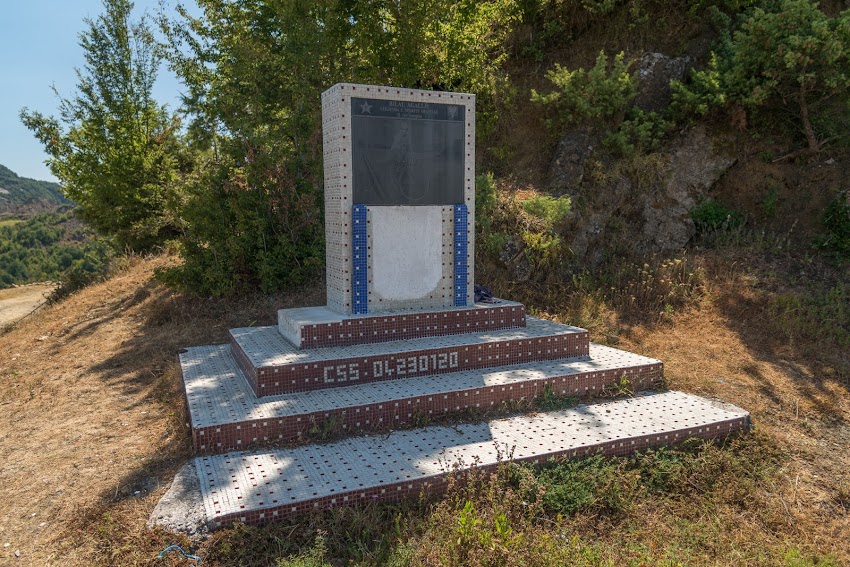 Przejrzystość powietrza dziś nie najlepsza, ale i tak widoki są niczego sobie. W najwyższym punkcie drogi tj. około 750 m n.p.m. stoi pomnik legendy albańskiego kolarstwa - Bilal Agalliu.